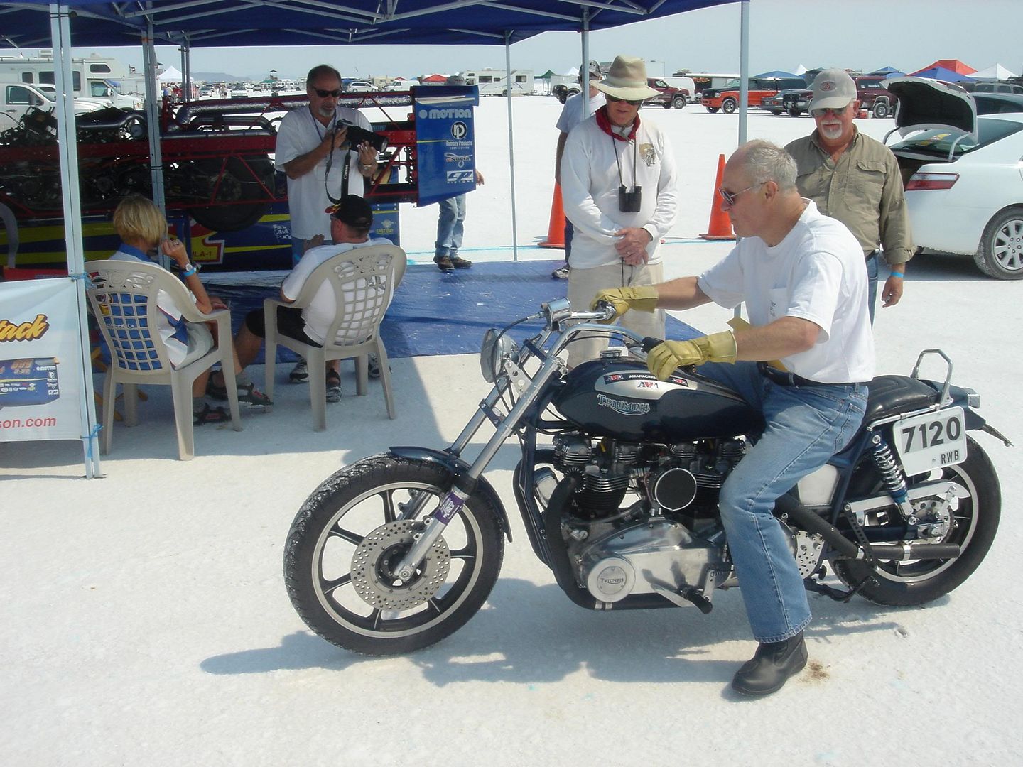 How about this for a sight for sore eyes and when i say sore eyes, thats from the blinding glare off the salt flats today, the rolling bones club drove down and they took their rides onto the lake and.